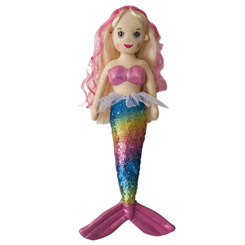 Gran oferta, juguete suave personalizado, juguetes de peluche de sirena con pelo rubio rizado, muñeca de moda, vestido de sirena, muñeca grande de lentejuelas arcoíris para niña